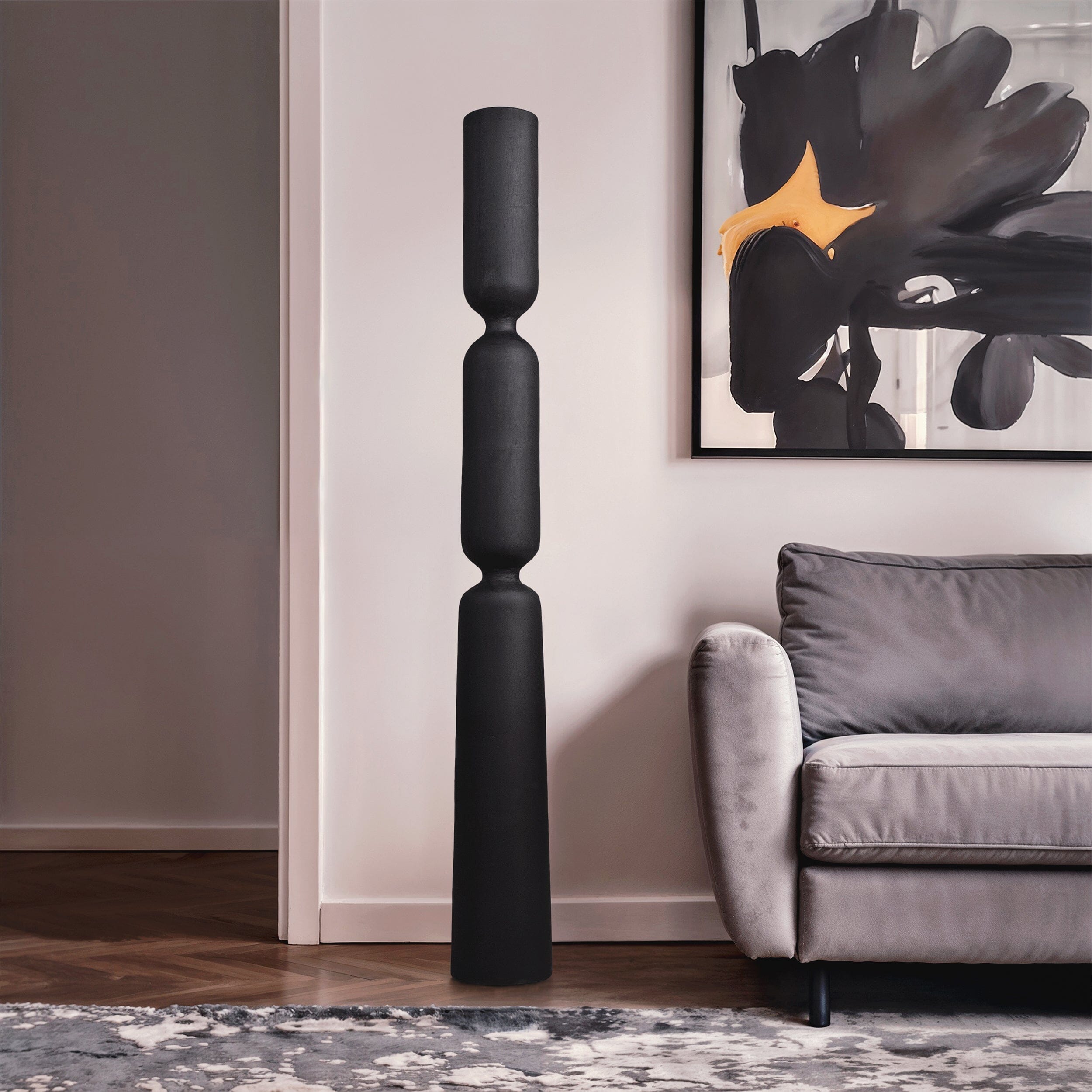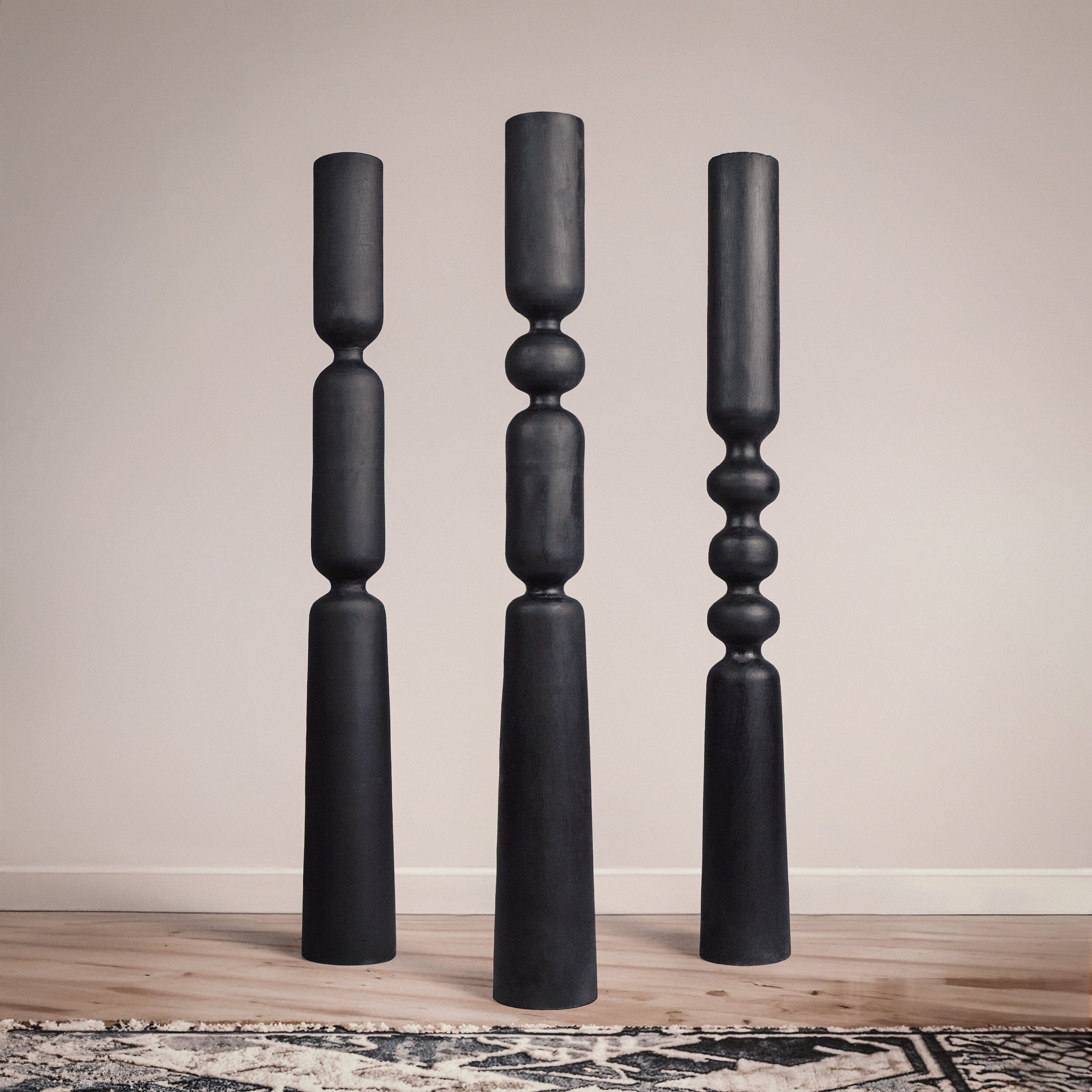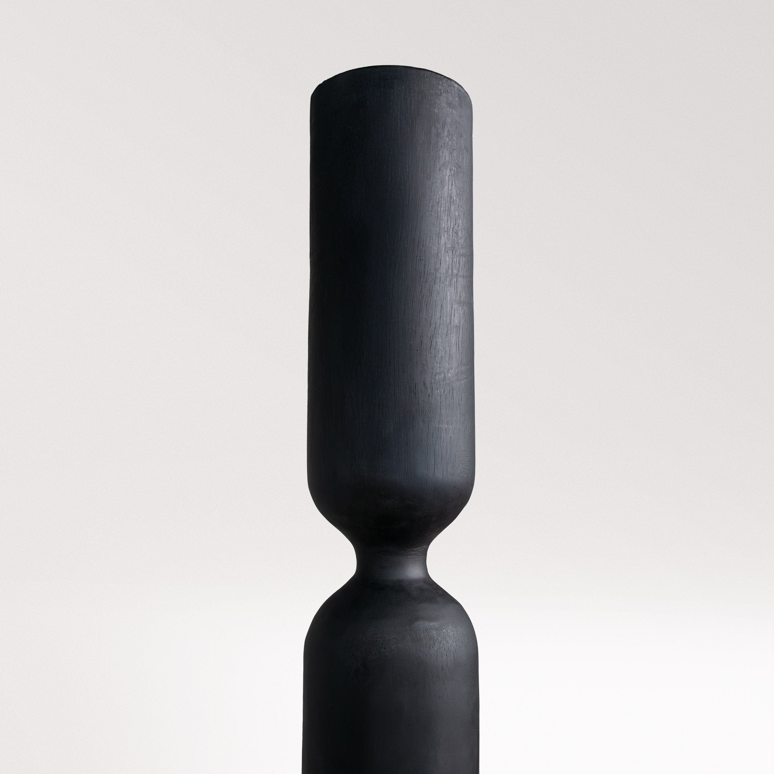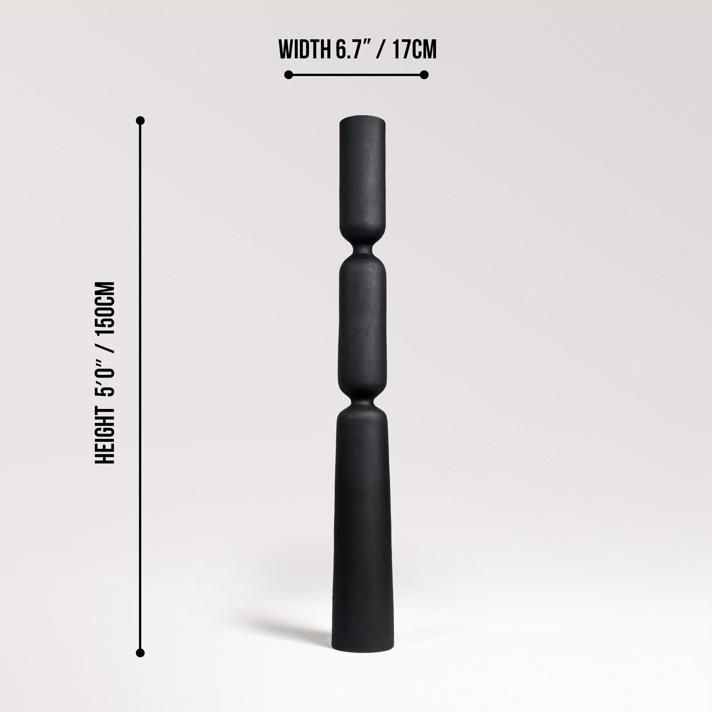 Handcrafted from solid wood using traditional artisan tools, Silent Pillar balances strength and stillness through stacked segments and clean symmetry. Its charcoal-black finish adds bold contrast, creating a grounded, architectural presence in both indoor and outdoor settings.