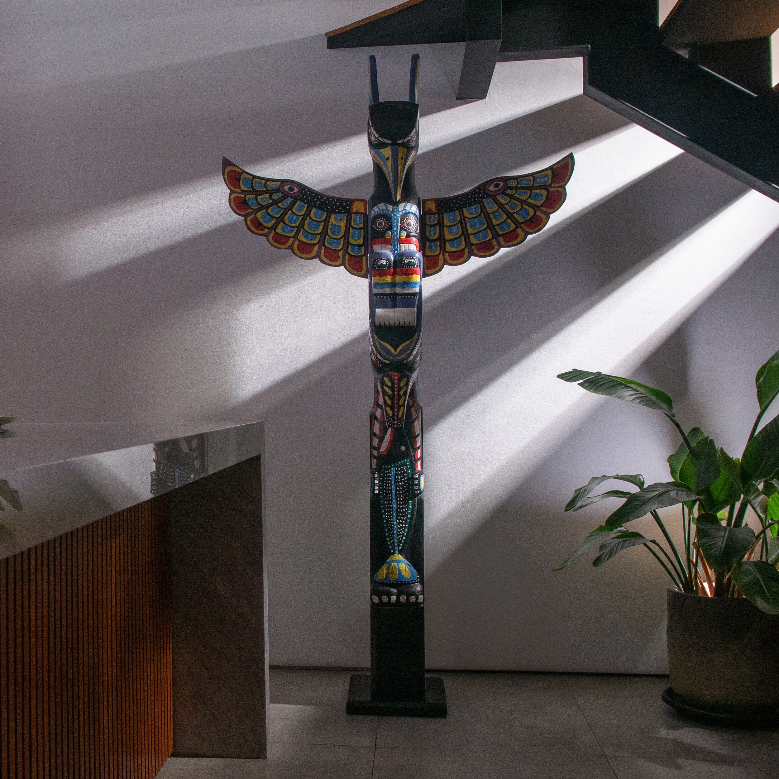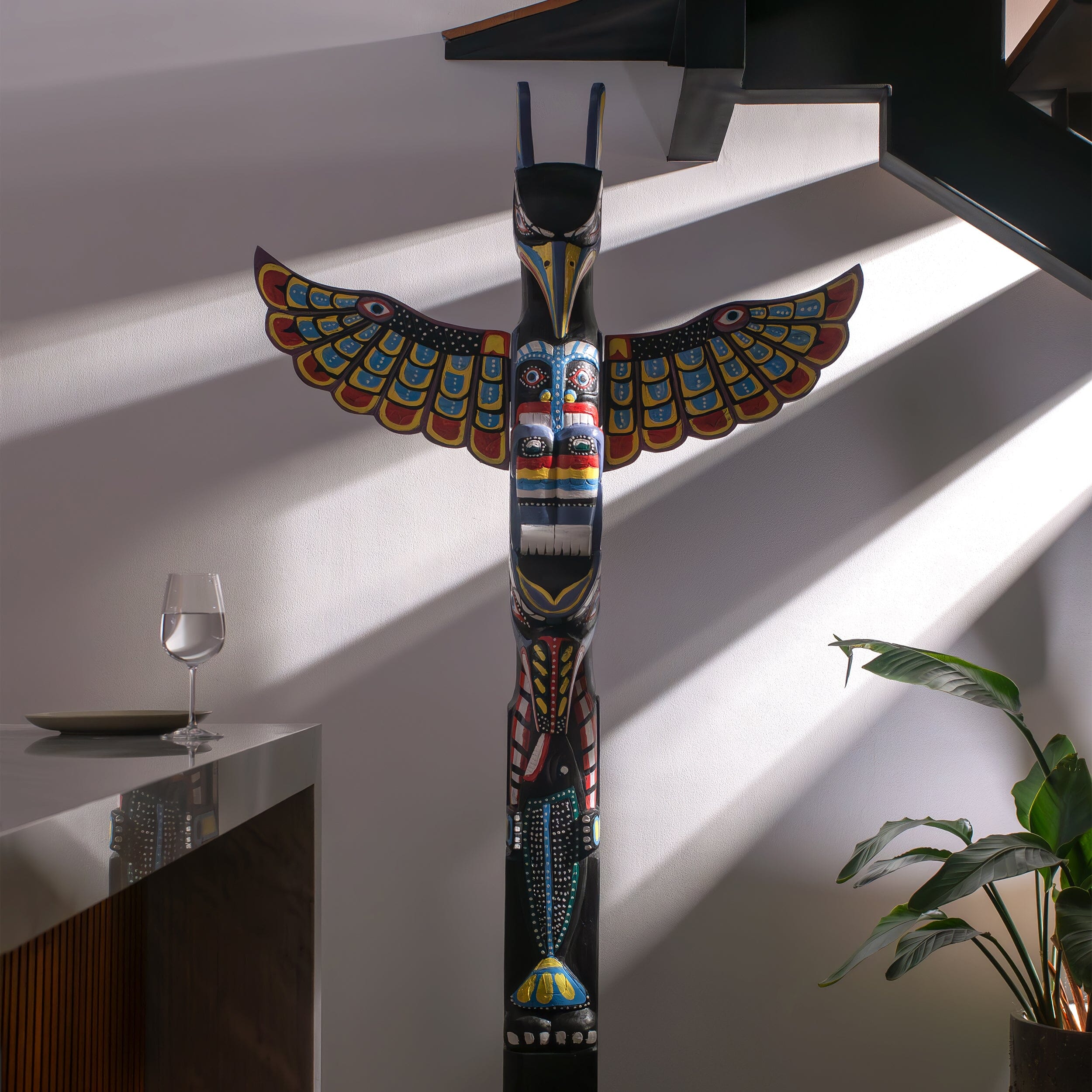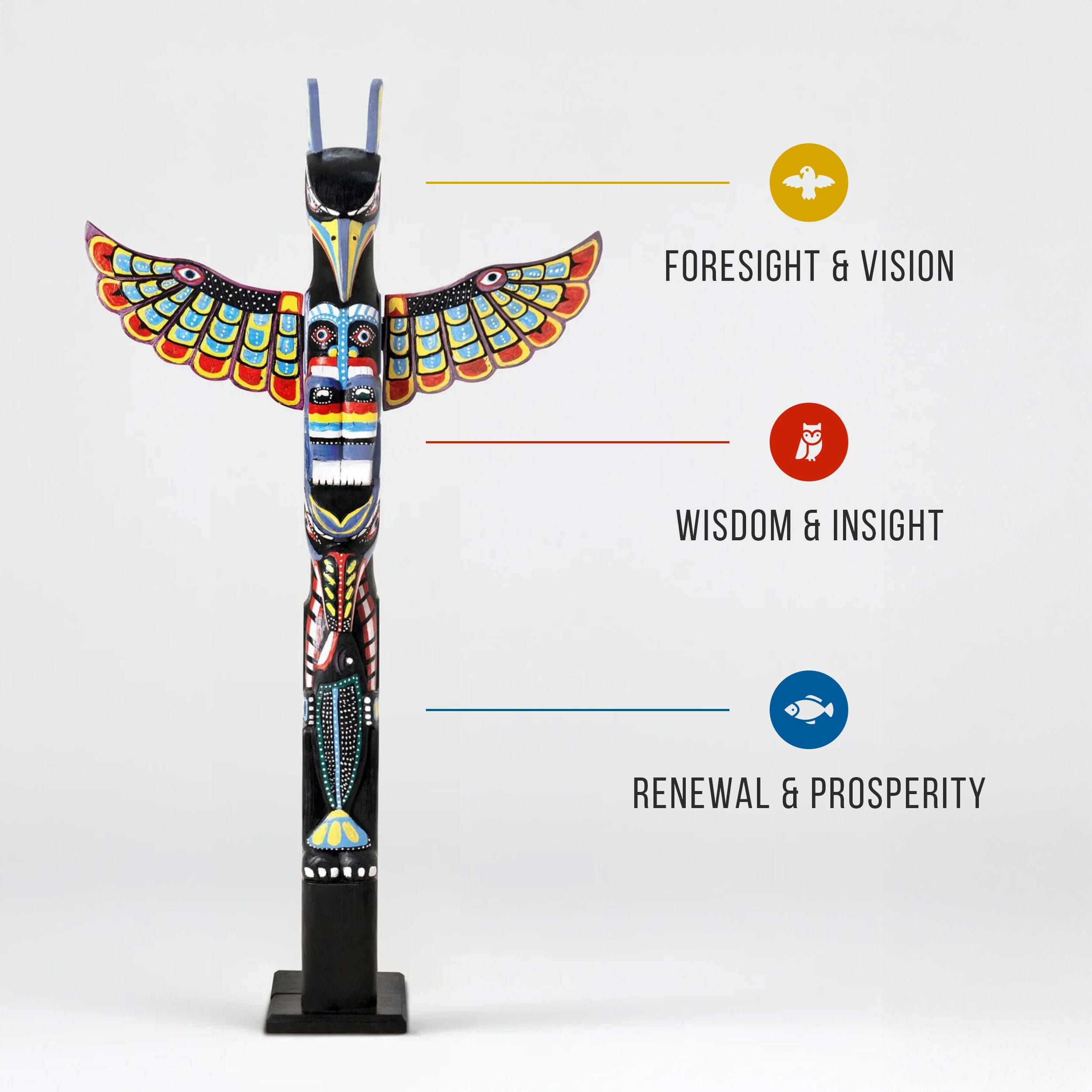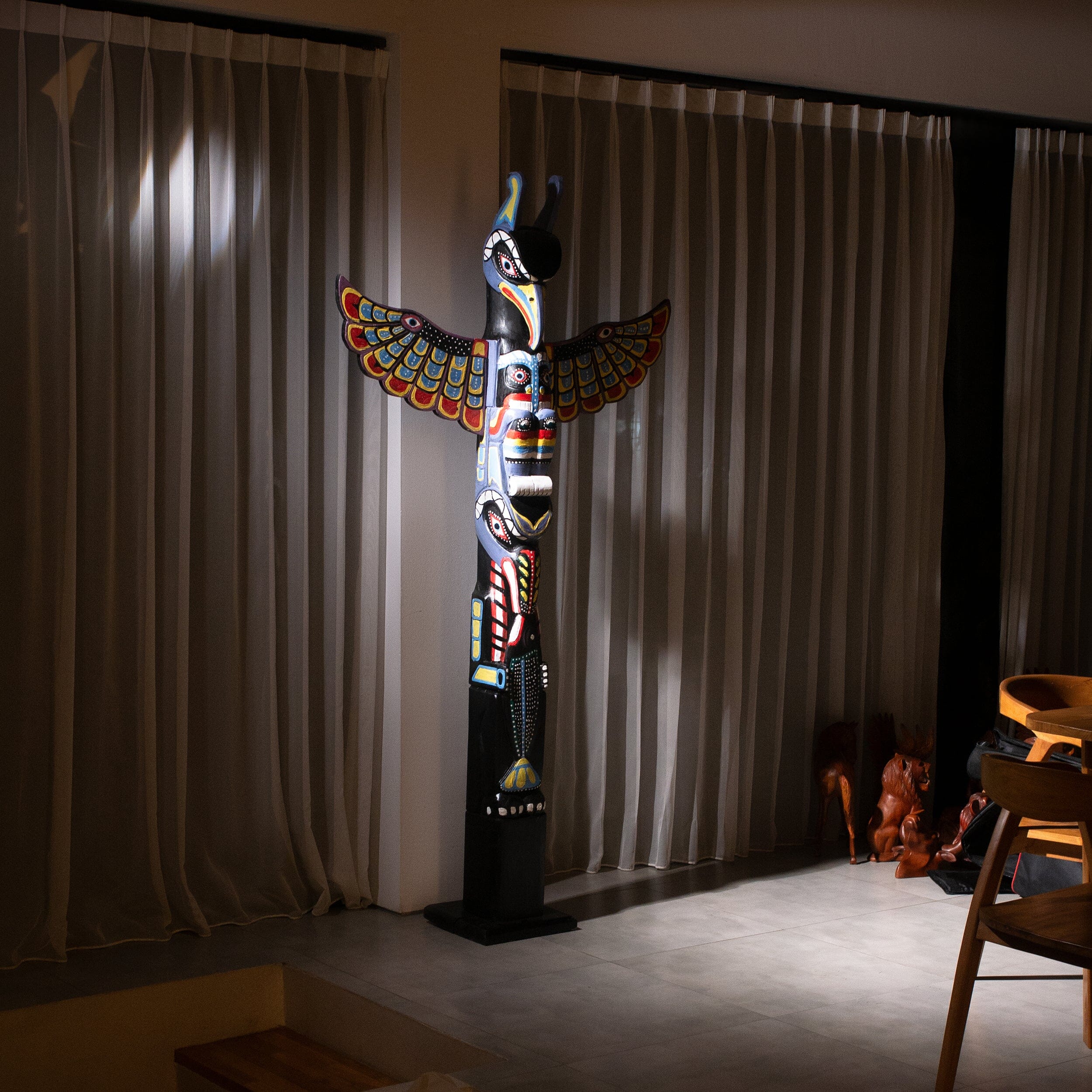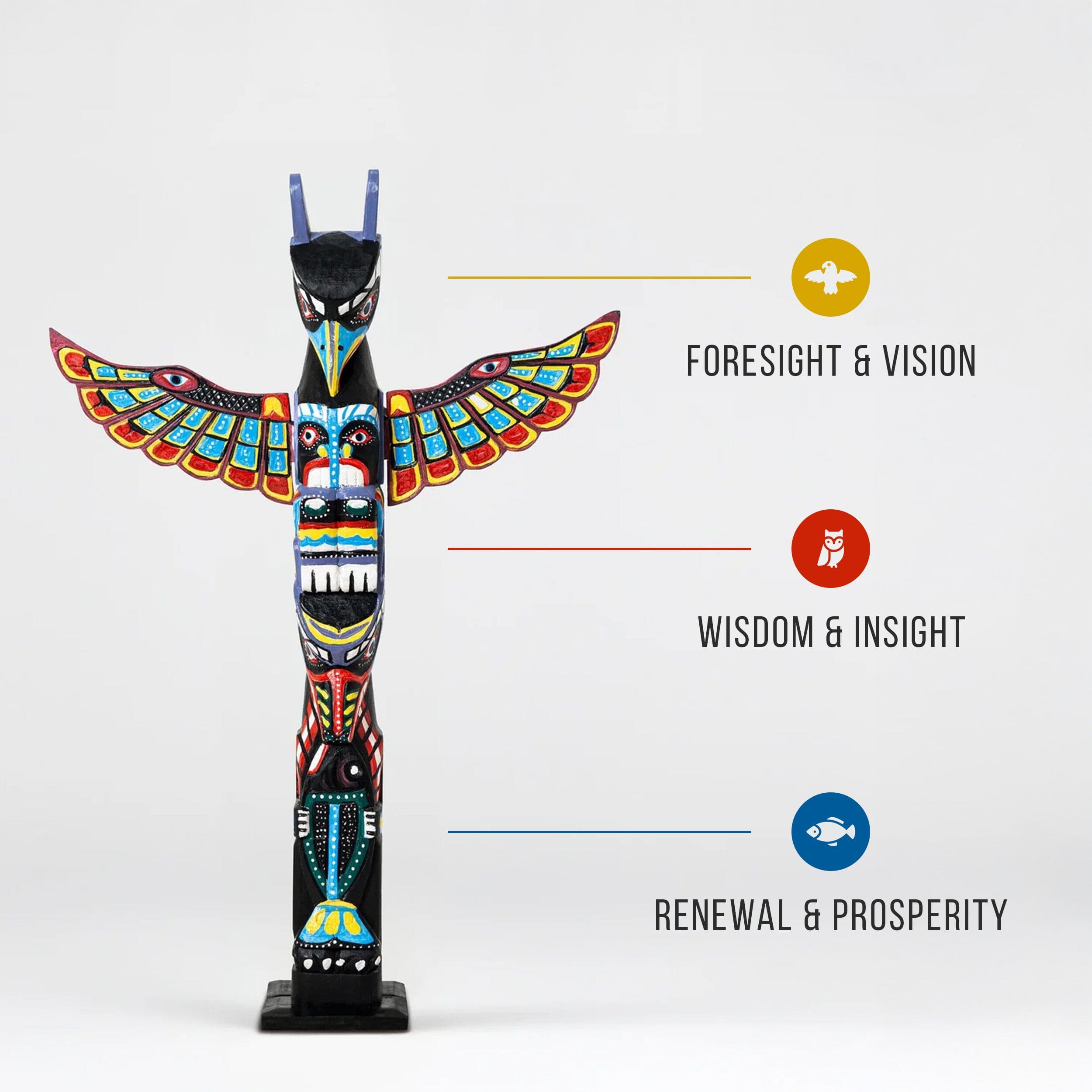 Our hand-carved Totem Pole, crafted with the utmost precision from high-quality wood, embodies rich storytelling. This unique piece features a majestic eagle for vision, an owl symbolizing wisdom, and a salmon representing life’s renewal, each detail meticulously carved by skilled artisans.