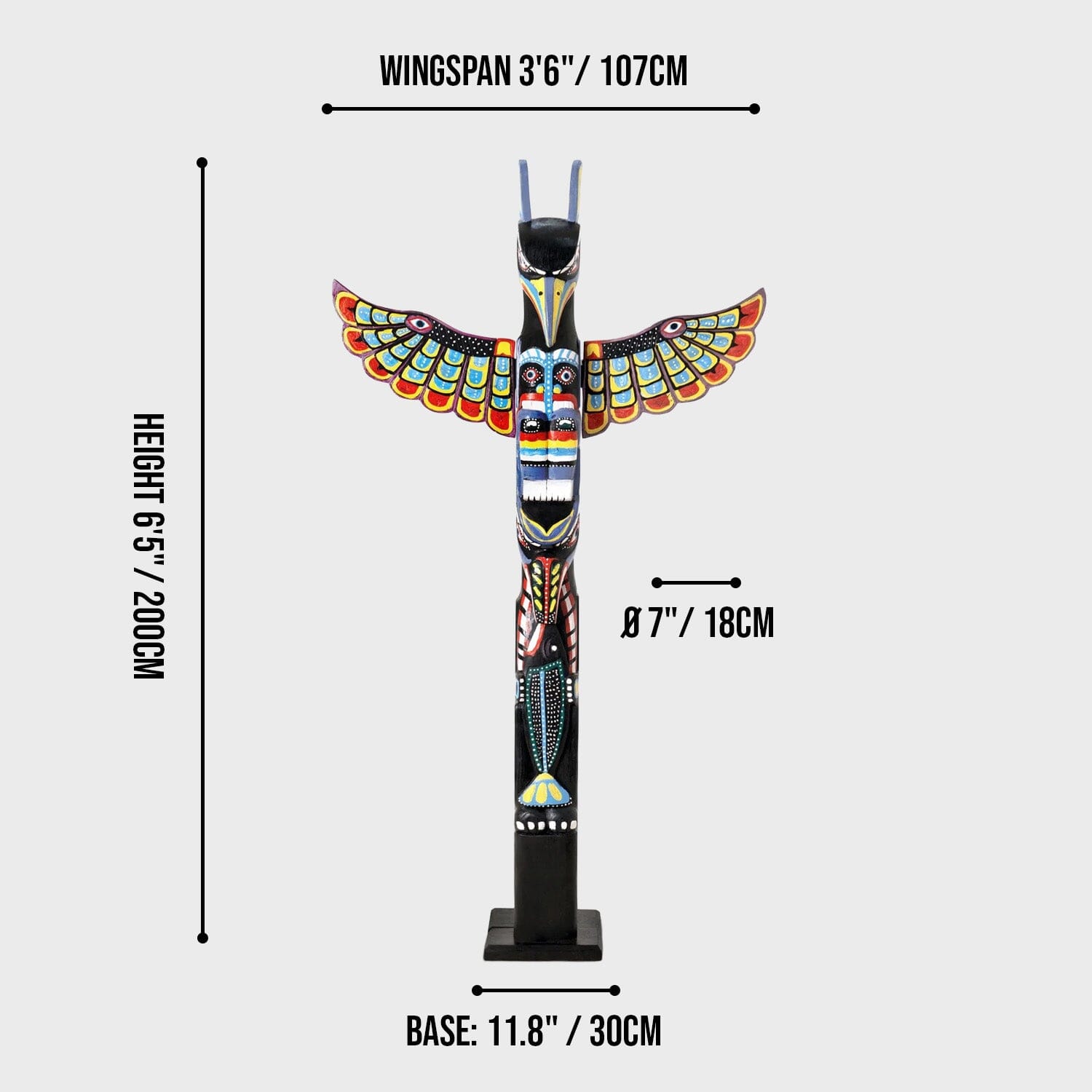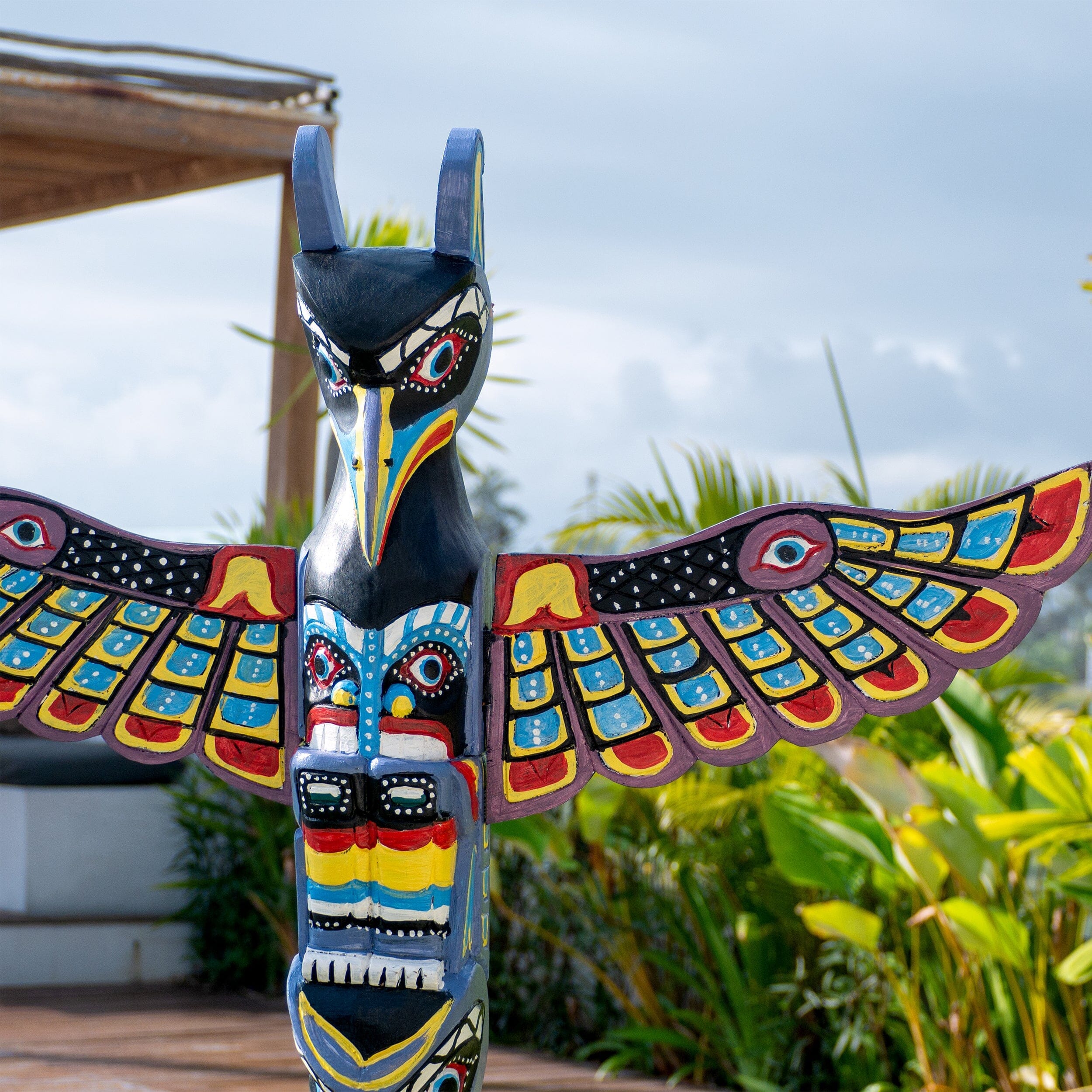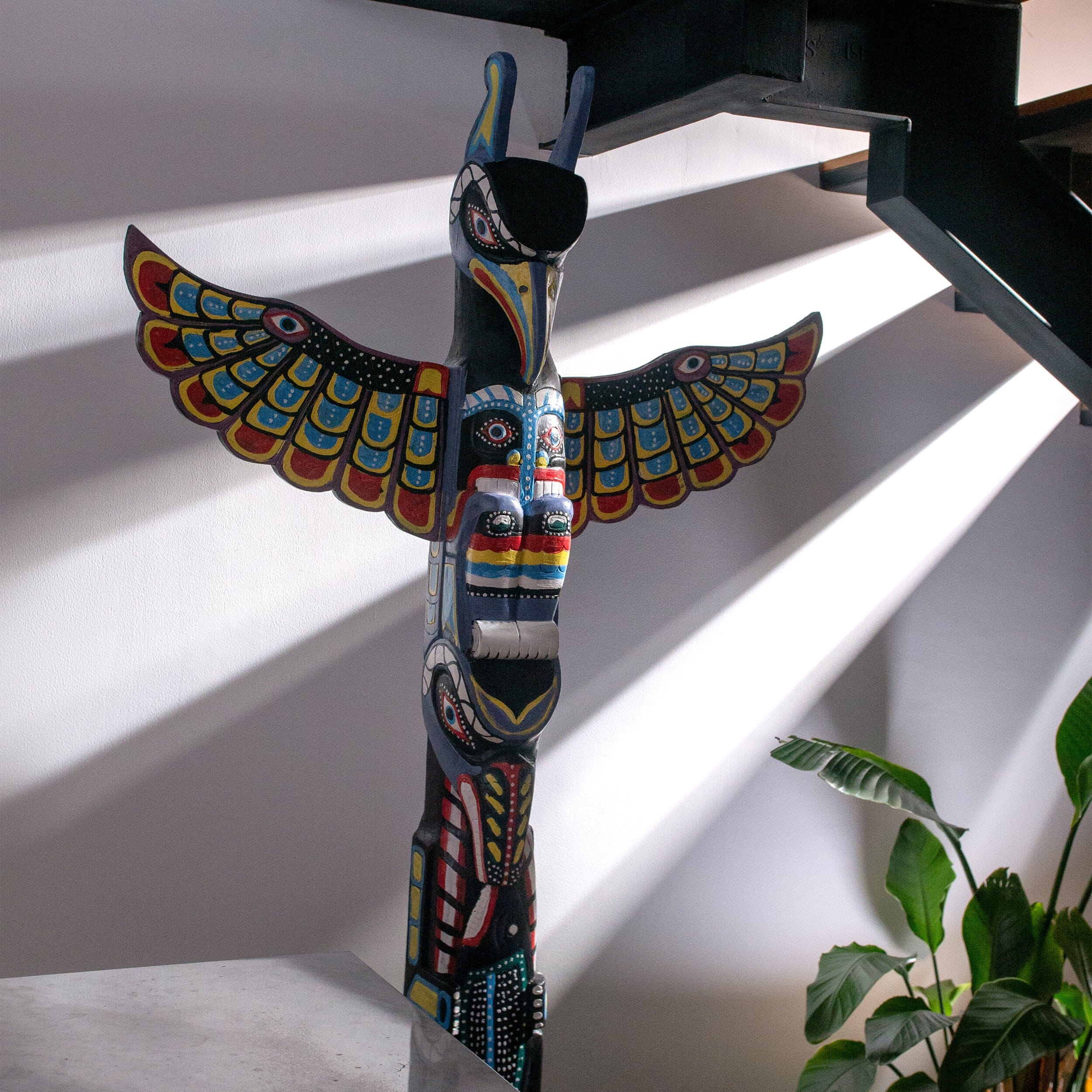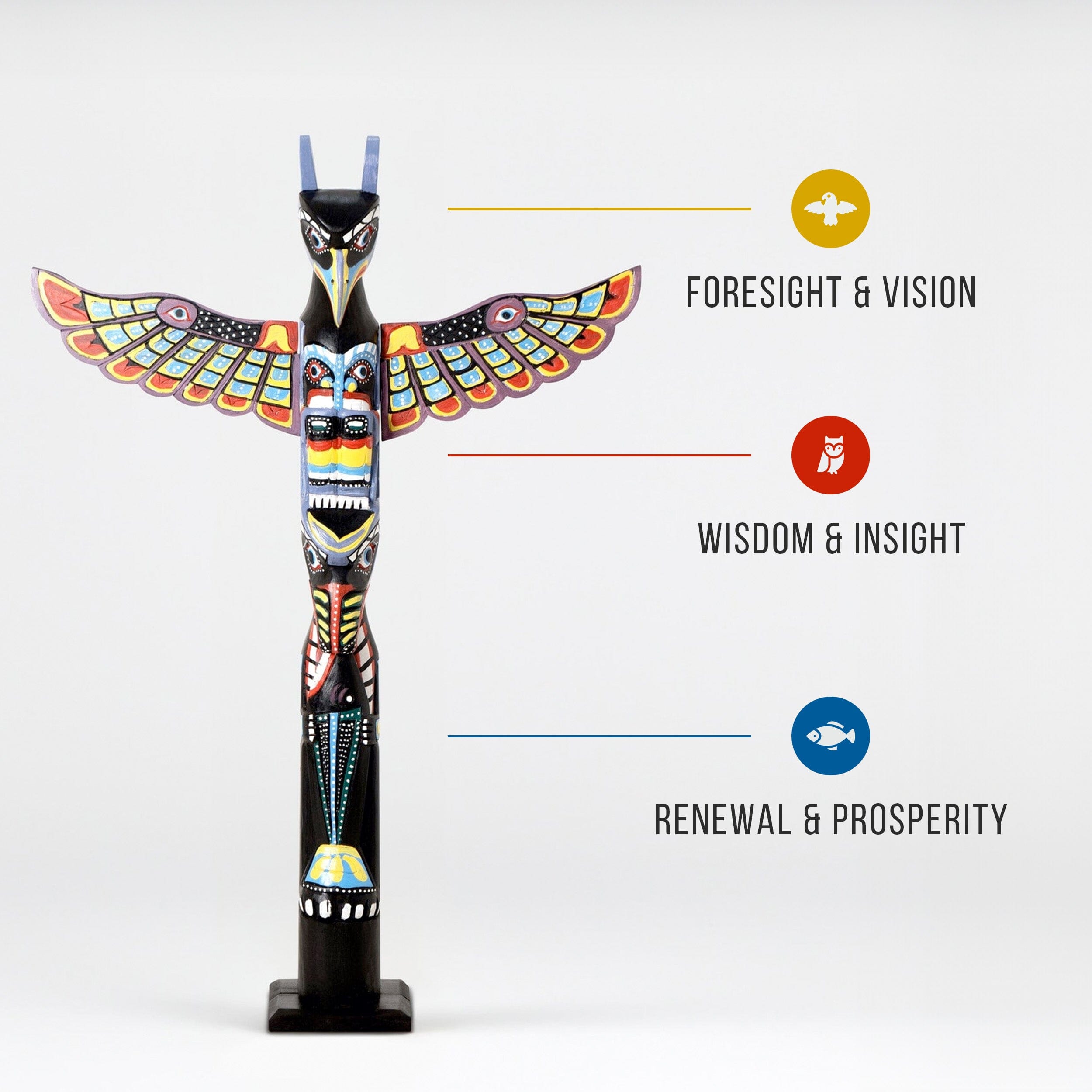 Our hand-carved Totem Pole, crafted with the utmost precision from high-quality wood, embodies rich storytelling. This unique piece features a majestic eagle for vision, an owl symbolizing wisdom, and a salmon representing life’s renewal, each detail meticulously carved by skilled artisans.