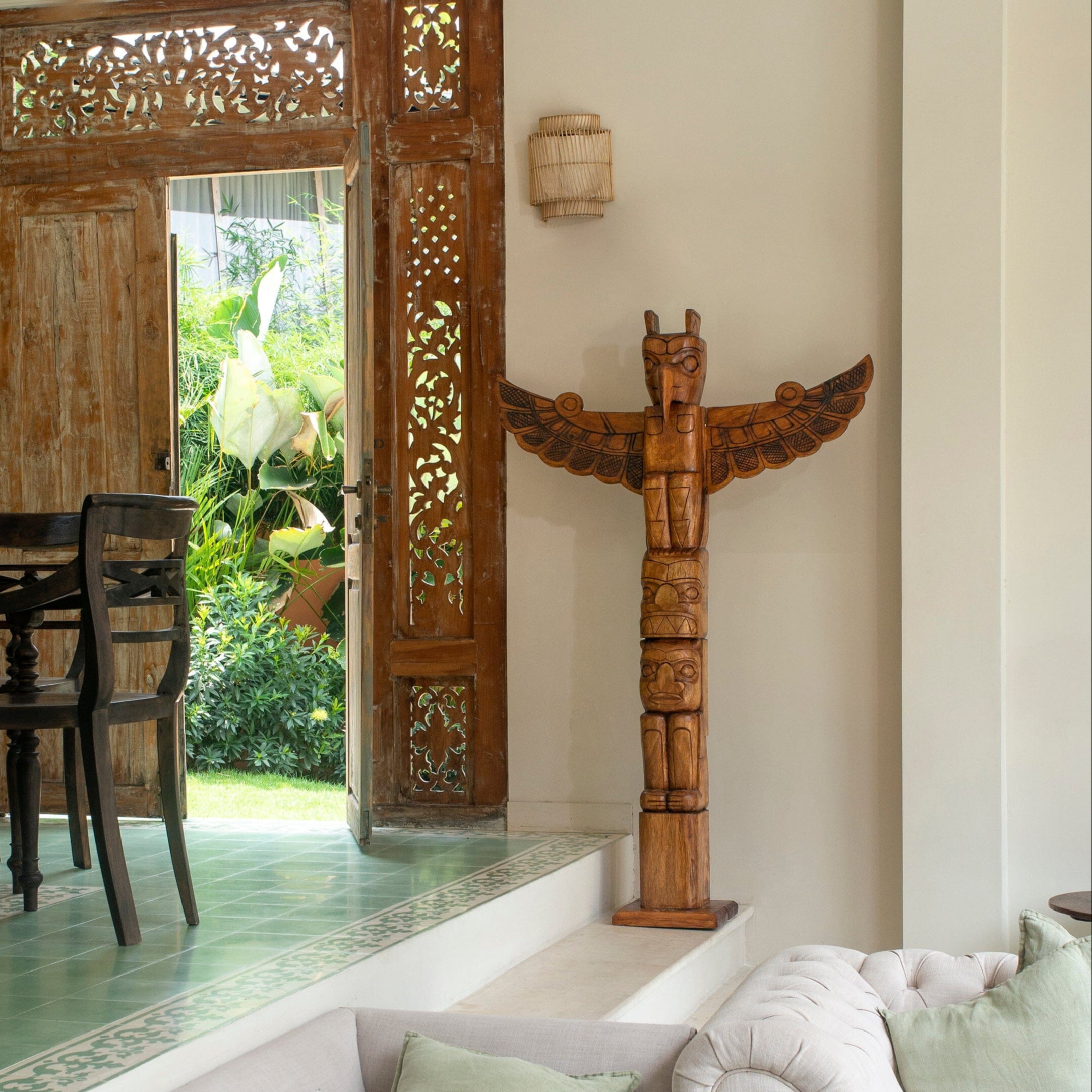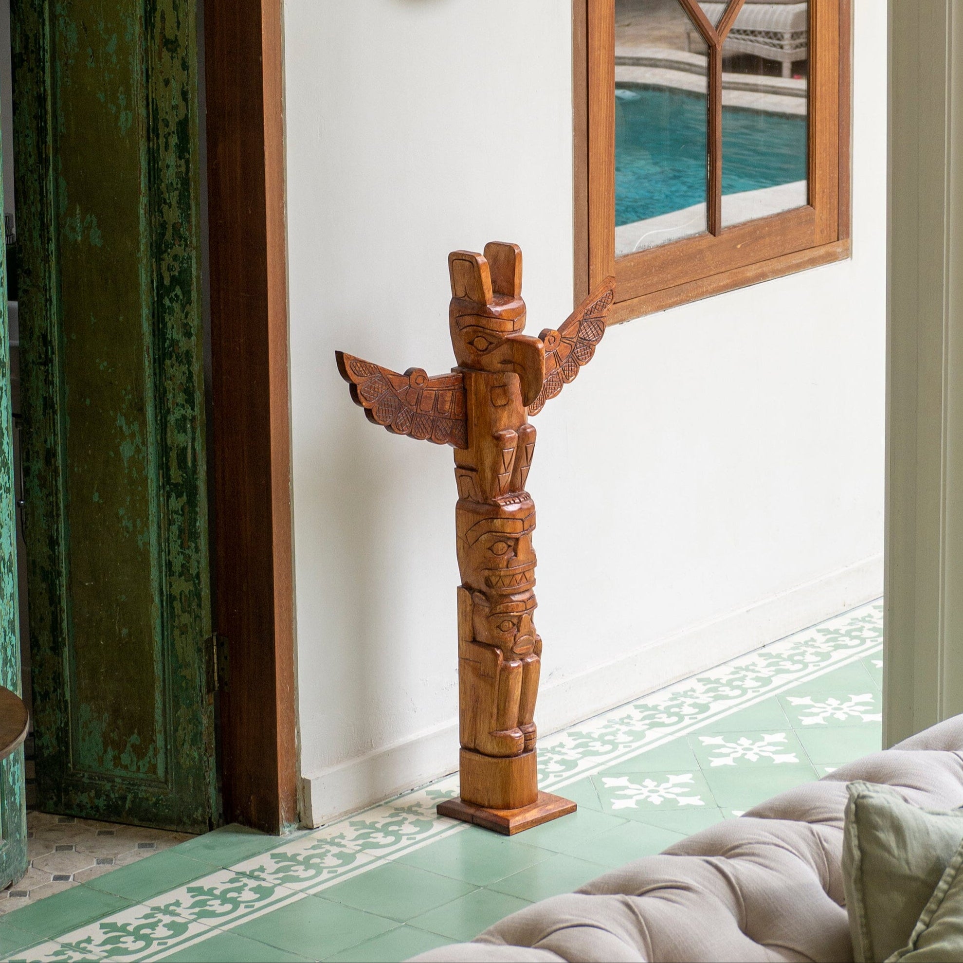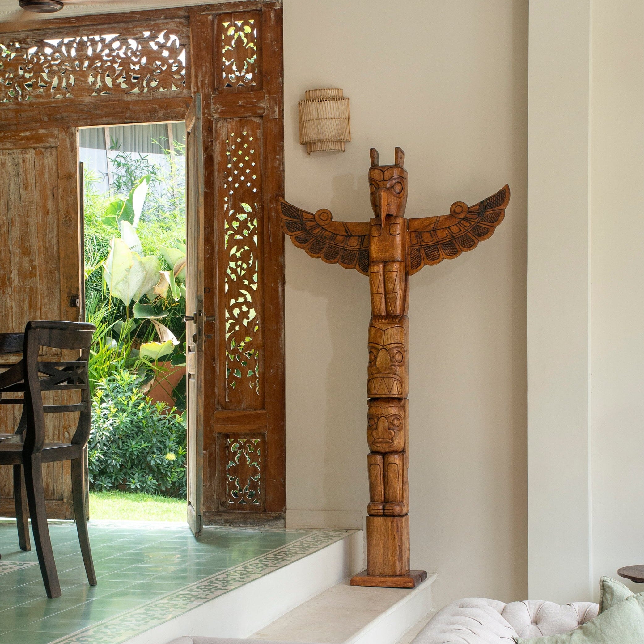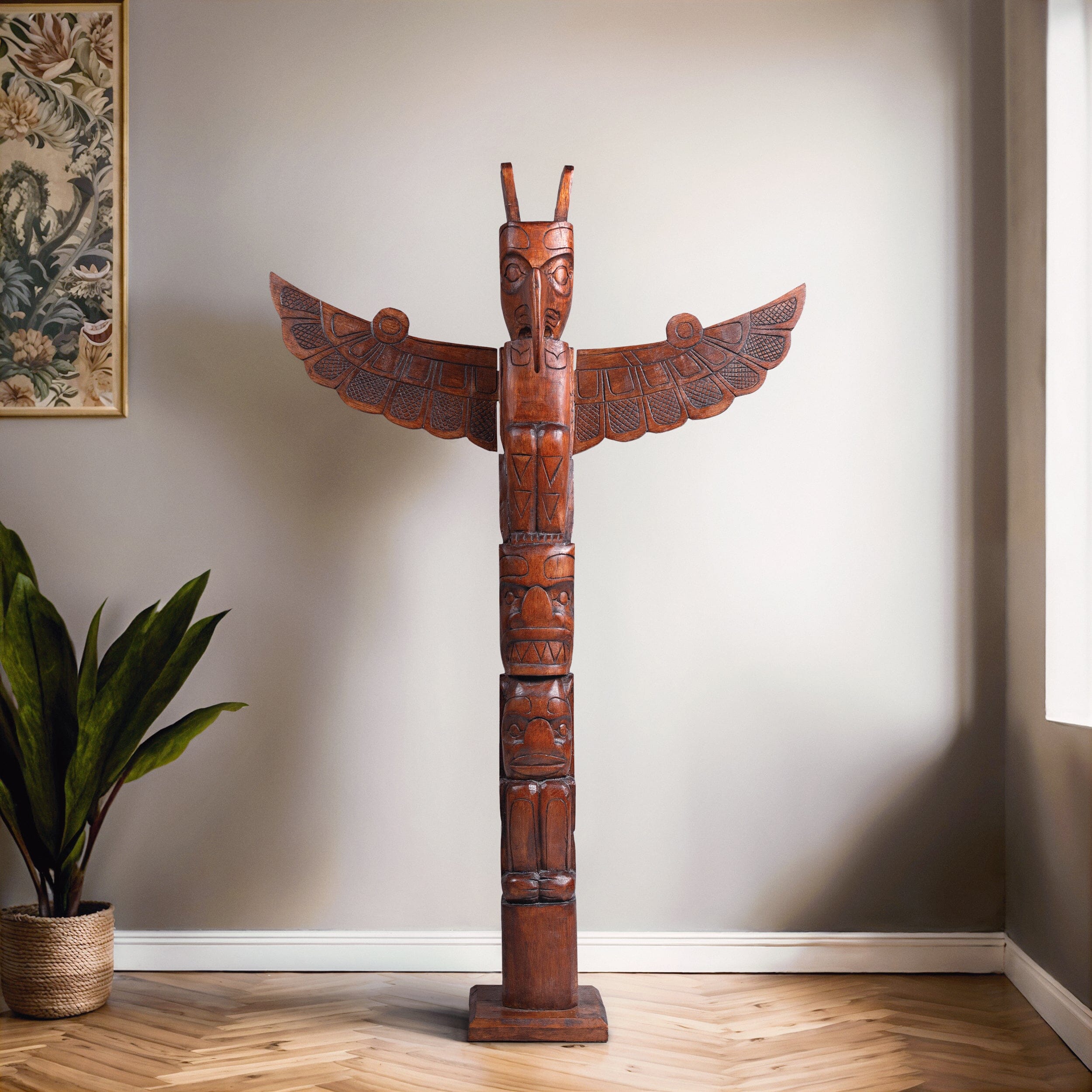 Our Totem Pole 'Orion' is carved with traditional symbols that carry unique meanings. The eagle brings foresight and vision, while the masks and faces honor the ancients – reminders of wisdom and heritage. Together, they create a meaningful piece of artistry that truly tells a story.