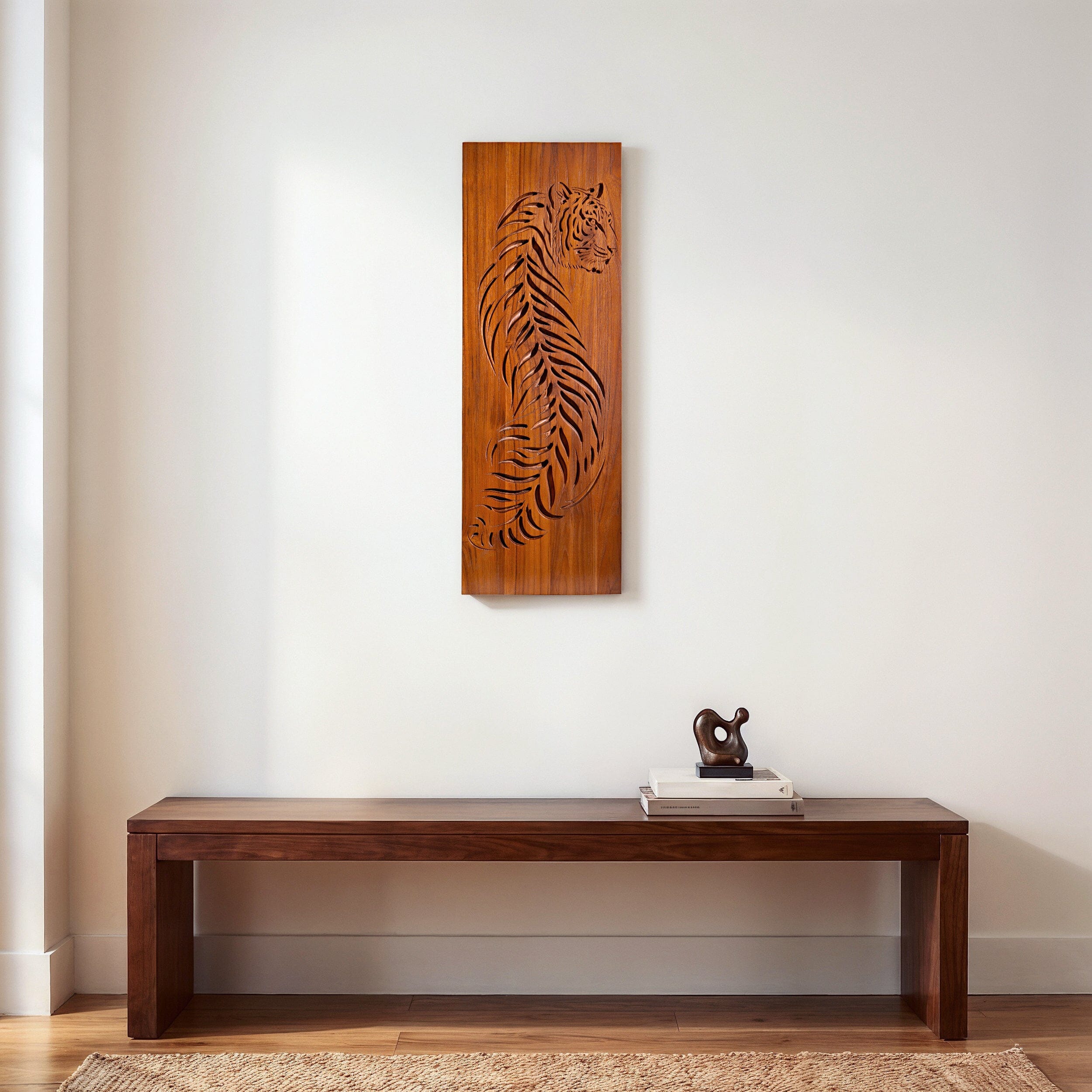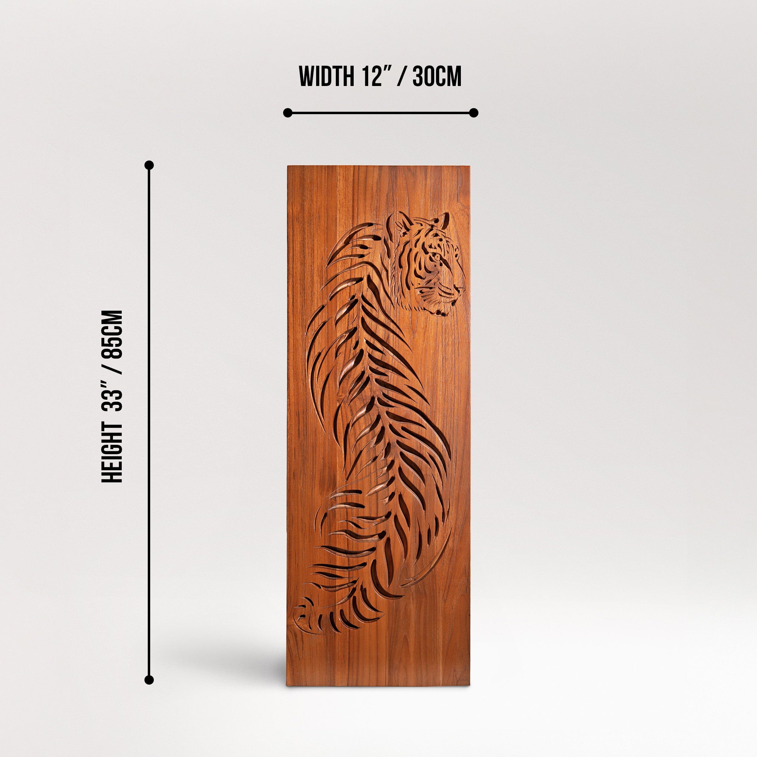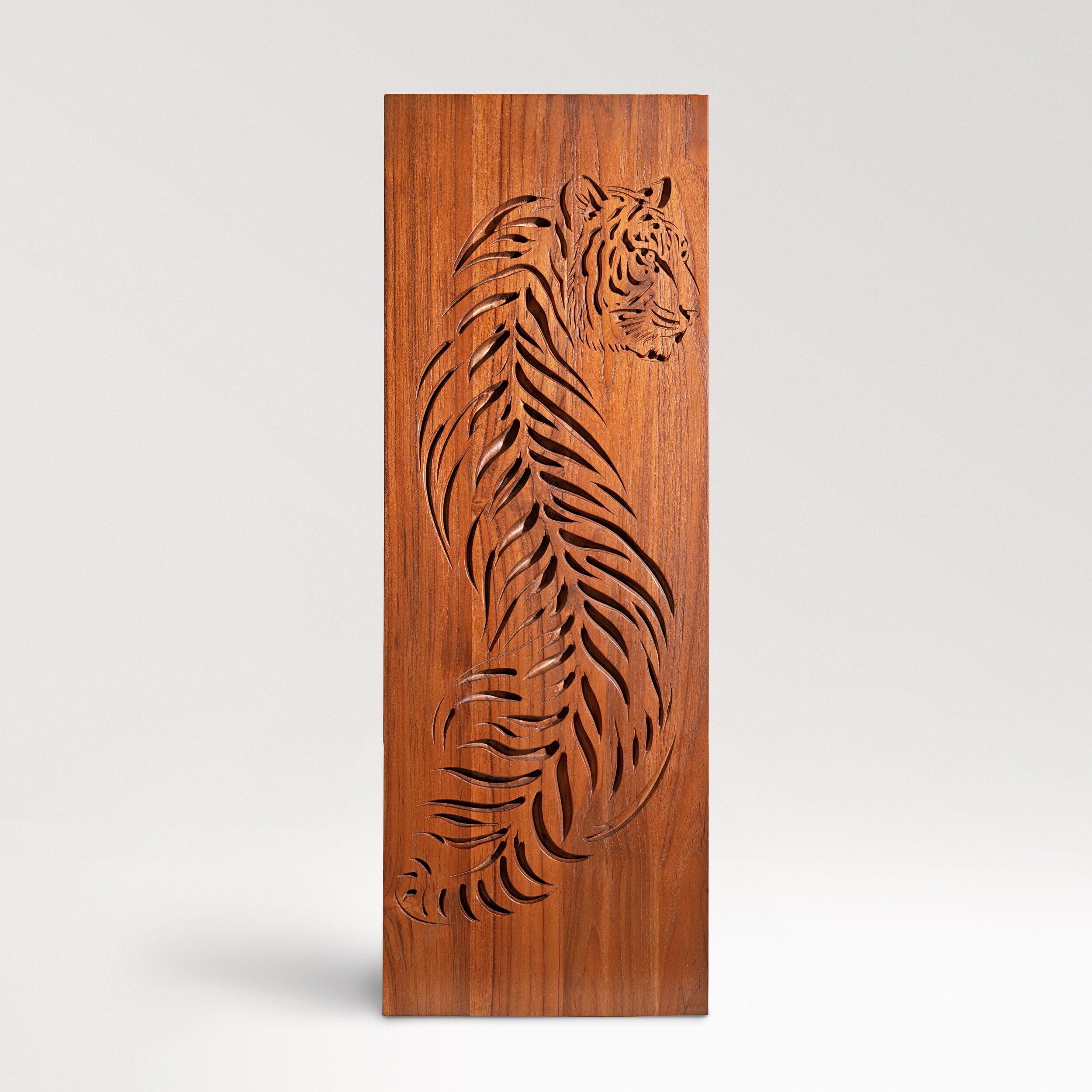 Handcrafted from premium teak wood, this wall panel features a tiger with a calm, confident presence. The flowing carving lines bring out its natural grace, while the rich wood grain adds warmth and depth. A striking yet refined piece that adds character, balance, and quiet strength to any space.