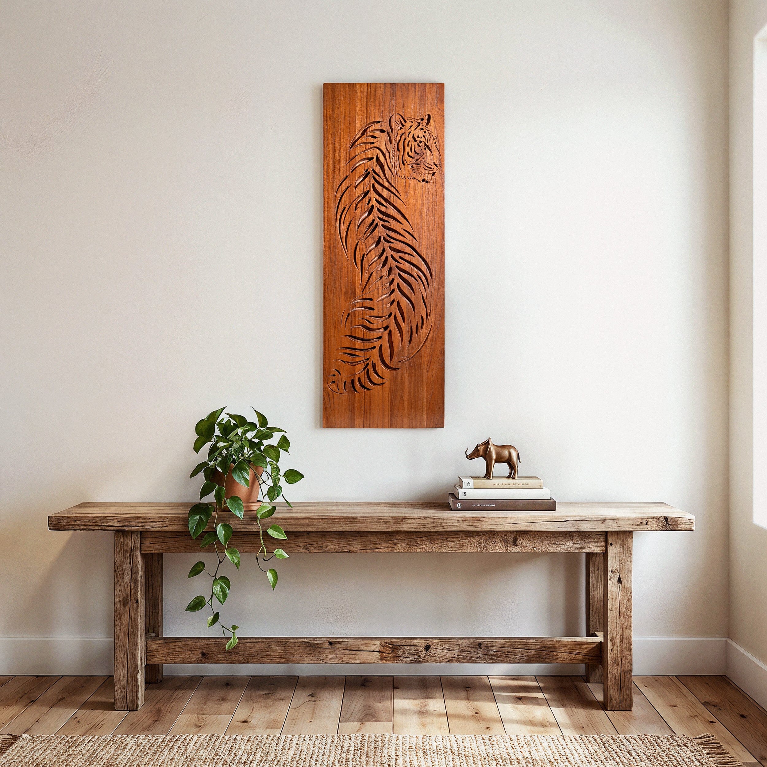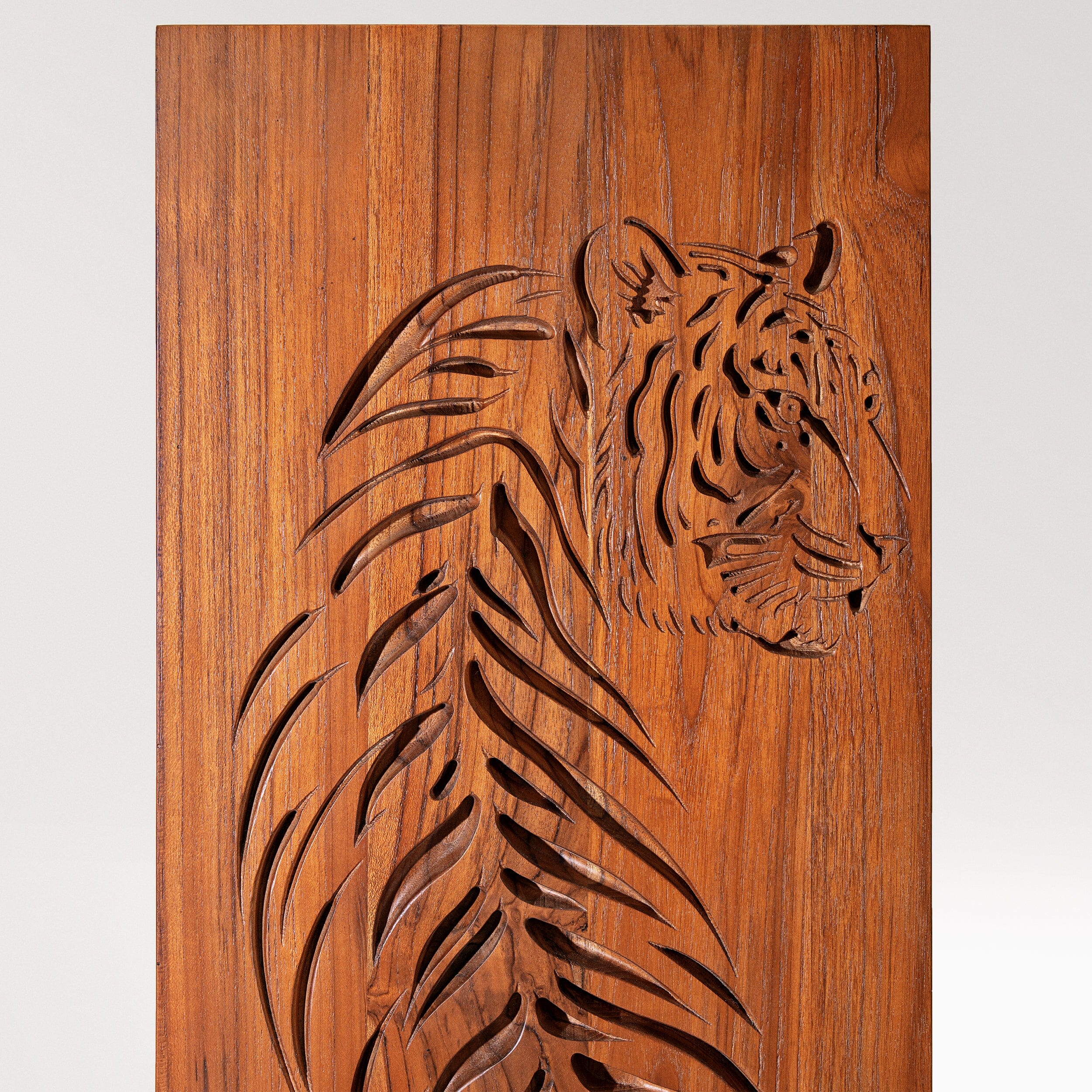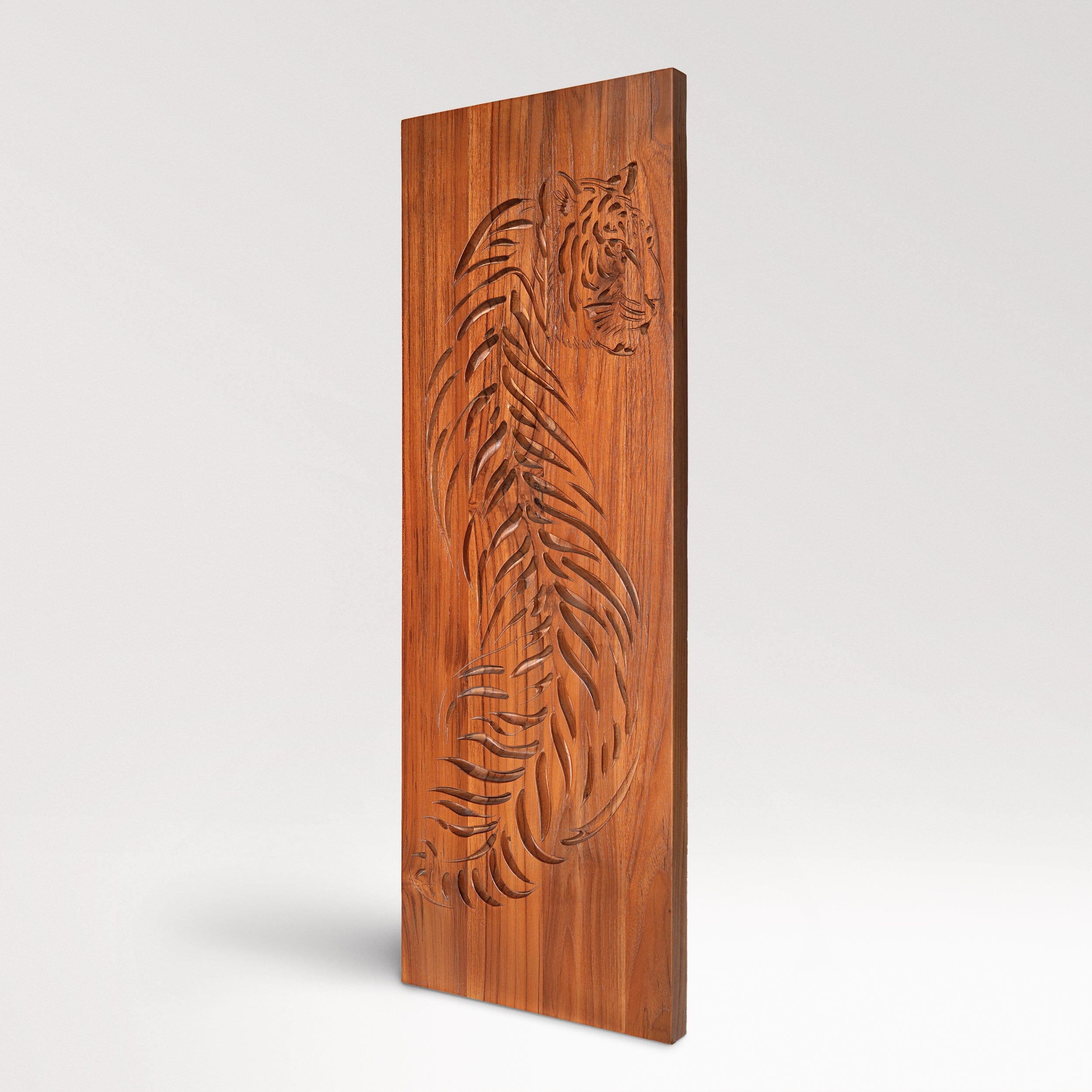 Handcrafted from premium teak wood, this wall panel features a tiger with a calm, confident presence. The flowing carving lines bring out its natural grace, while the rich wood grain adds warmth and depth. A striking yet refined piece that adds character, balance, and quiet strength to any space.