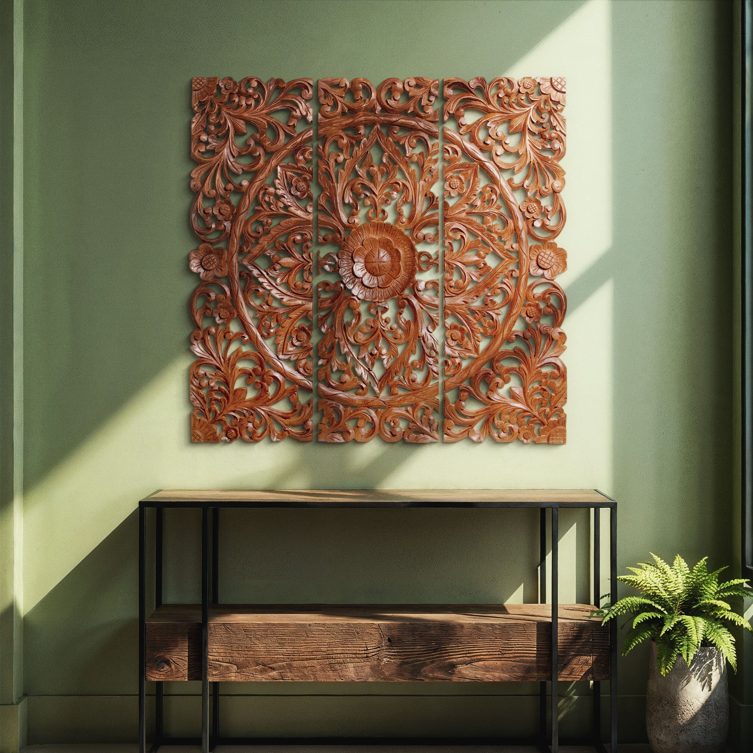 Handcrafted from rich teak wood, Lotus Mandala is where artistry meets inner calm. Flowing across three panels, its intricate floral design radiates balance, elegance, and peaceful energy. Every detail is meticulously shaped by hand, adding depth and soulful beauty to your space.